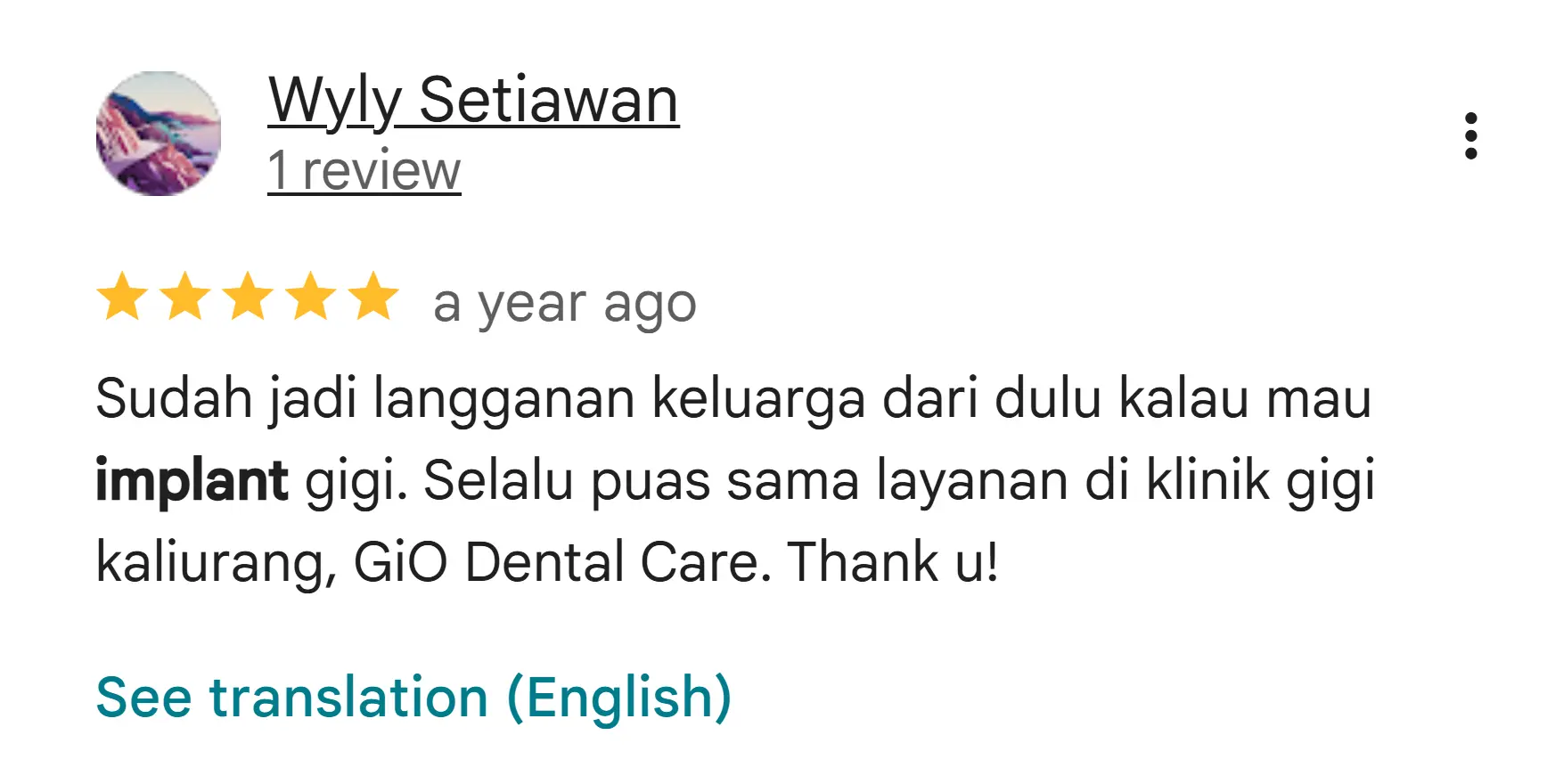 Berikut adalah beberapa review pasien yang telah menjalani perawatan implan gigi di GiO Dental Care.
